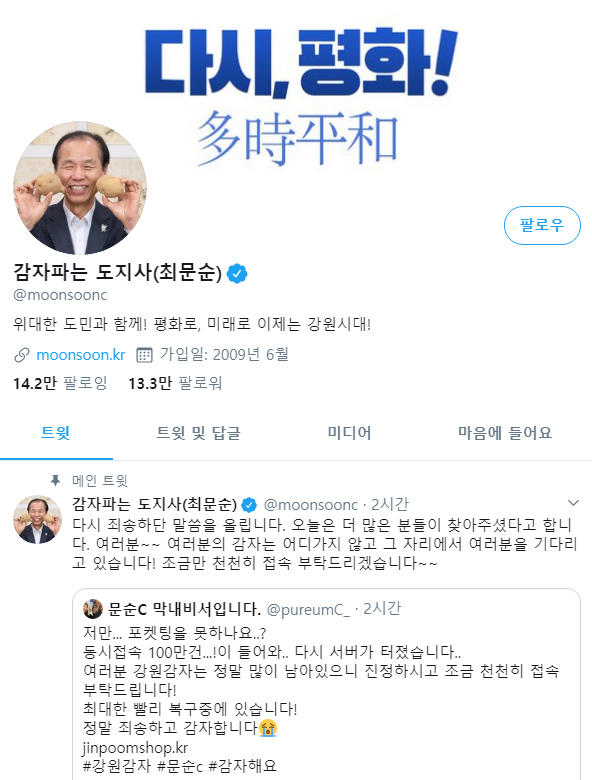 - 폭발적인 반응에 최 지사는 트위터 닉네임을 곧장 ‘감자파는 도지사(최문순)’로 바꾸며 본격적인 홍보를 시작했습니다. 그는 트위터리안들의 긍정적인 멘션 세례에 "감자합니다(감사합니다)"라며 센스 있는 답변까지 잊지 않았습니다. 최 지사 …