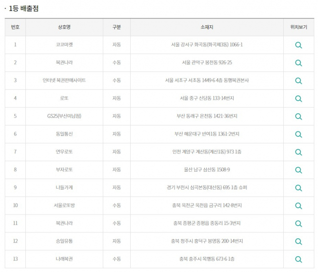 - 로또 1등 당첨금 16억, 배출점은 서울 4곳 부산 2곳 등 총 13곳