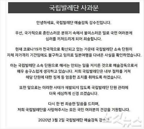 국립발레단은 징계 결과를 발표하면서 "코로나19로 인해 국가적으로 엄중한 시기에 국립단체로서 물의를 일으킨 점에 대해 다시 한 번 깊이 반성한…