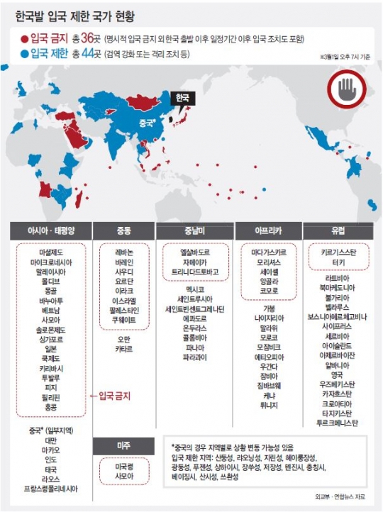 - 이스라엘은 한국 정부와 협의도 없이 한국인 입국을 전면적으로 금지하는 등 ‘코리아 포비아’(한국인 공포증‘이 확산하는 모양새다. 미국령 사모아 등 3개국은 코로나19가 발생하지 않은 국가에서 14일 동안 체류하고 미감염 사실을 입증…