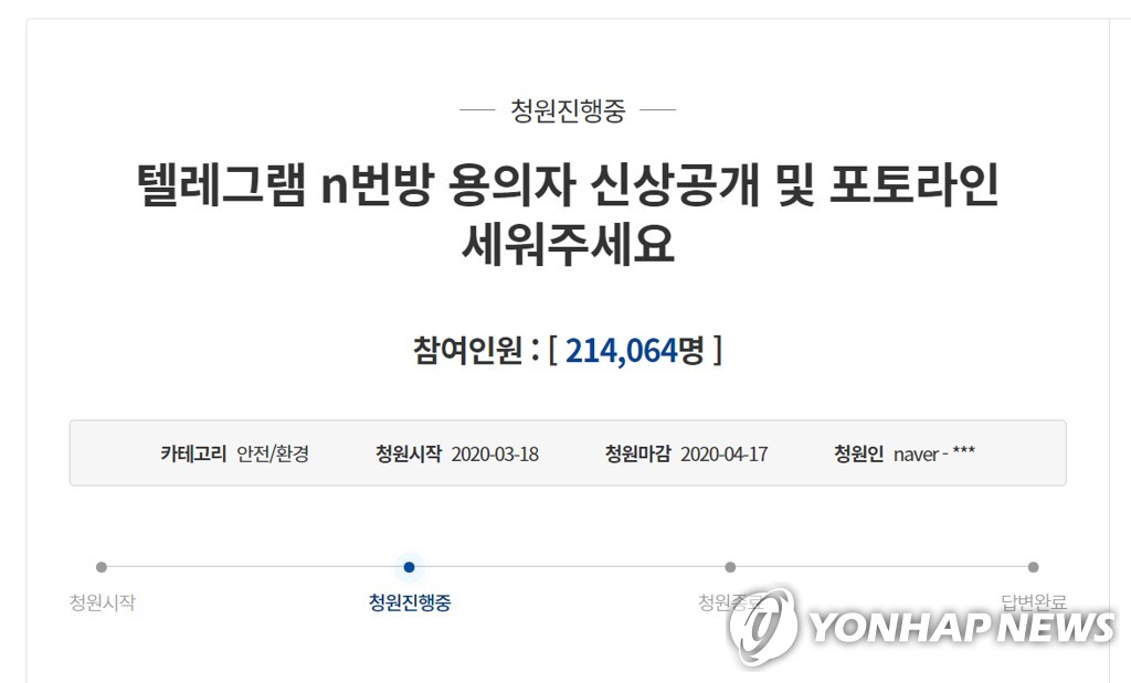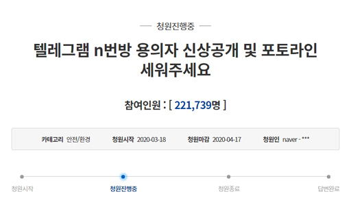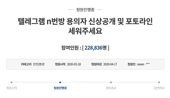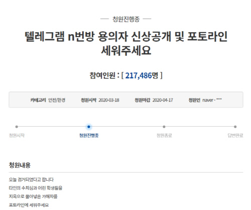 - ‘텔레그램 N번방 피의자 신상공개’…국민청원 이틀 만에 20만명