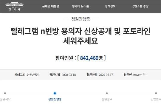- "텔레그램 n번방 피의자 신상공개" 국민청원 84만명 돌파